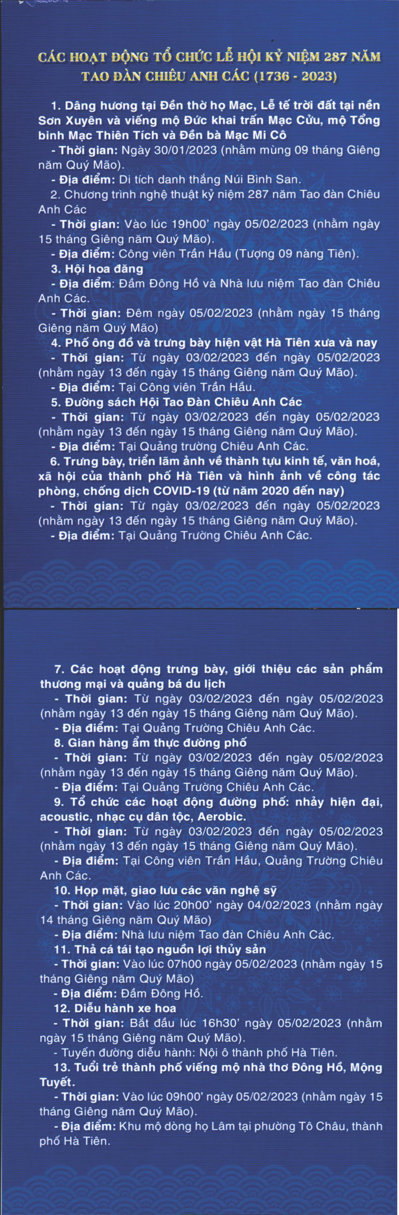 aA Lễ hội truyền thống Danh sách các hoạt động Tổ chức lễ hội kỷ niệm 287 năm Tao Đàn Chiêu Anh Các (1736-2023) 27/01/2023, 16:48 Quay về Chia sẻ Z Copy link thành công Tin khác Thành phố Hà Tiên tổ chức Lễ hội kỷ niệm 289 năm thành lập Tao đàn Chiêu Anh Các (1736 – 2025) Lễ hội truyền thống 10/02/2025 Chương trình Lễ hội kỷ niệm 288 năm ngày mất Đức khai trấn Mạc Cửu Lễ hội truyền thống 03/07/2023 Chương trình nghệ thuật Tao Đàn Chiêu Anh Các Lễ hội truyền thống 27/01/2023 Chương trình Lễ Hà Tiên hoàn thành nhiệm vụ xây dựng nông thôn mới Lễ hội truyền thống 21/06/2022 Chương trình nghệ thuật Kỷ niệm 256 năm ngày mất của Bà Mạc Mi Cô (1763-2019 ) Lễ hội truyền thống 04/11/2019 Lễ giỗ Mạc Cửu Lễ hội truyền thống 13/08/2019 Tiết Thanh Minh của người Hoa Hà Tiên Lễ hội truyền thống 13/08/2019 Lễ hội năm văn hóa - Du lịch và Tao đàn Chiêu Anh Các Lễ hội truyền thống 13/08/2019 Lễ giỗ Mạc Mi Cô Lễ hội truyền thống 13/08/2019 Hà Tiên tổ chức Lễ giỗ lần thứ 283 Đức khai trấn Mạc Cửu (1735 - 2018) Lễ hội truyền thống 01/08/2018 /danh-sach-cac-hoat-dong-chuc-le-hoi-ky-niem-287-nam-tao-dan-chieu-anh-cac-1736-2023
