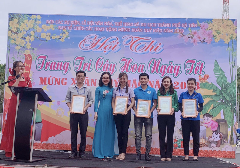 Ban Tổ chức hội thi trang trí cây hoa ngày tết mừng xuân Quý Mão năm 2023 TP. Hà Tiên trao giải cho các đơn vị dự thi.