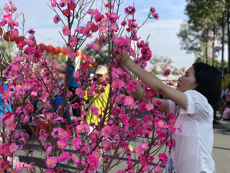 Thí sinh trang trí cây hoa đào tại hội thi trang trí cây hoa ngày tết mừng xuân Quý Mão 2023