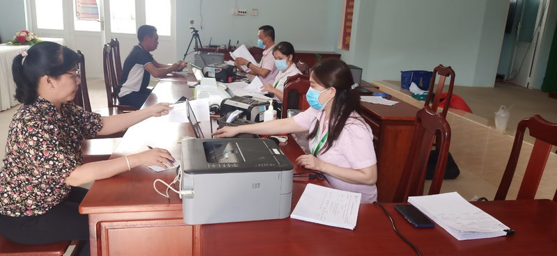 Ảnh: Cán bộ Ngân hàng chính sách xã hội giao dịch xã