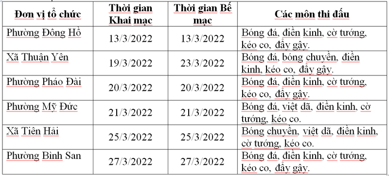 Ngay sau khi kết thúc Đại hội TDTT phường điểm Tô Châu, các xã, phường còn lại trên địa bàn thành phố sẽ tiếp tục tổ chức Đại hội TDTT của địa phương mình với lịch tổ chức như sau: