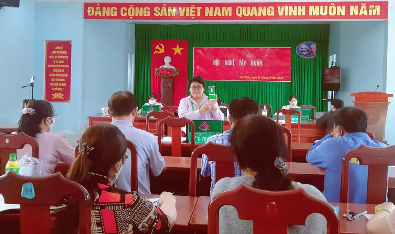 Cán bộ NHCSXH tuyên truyền đến khách hàng thực hiện đăng ký dịch vụ và hướng dẫn khách hàng sử dụng dịch vụ Mobile Banking