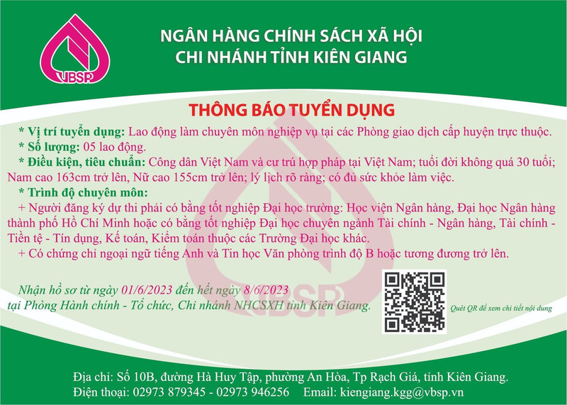 aA Ngân hàng Chính sách xã hội Ngân hàng Chính sách xã hội tỉnh Kiên Giang Thông báo tuyển dụng 19/05/2023, 15:40 Quay về Chia sẻ Z Copy link thành công Tin khác GIỮ VỮNG DÒNG VỐN CHÍNH SÁCH TRONG GIAI ĐOẠN CHUYỂN TIẾP ĐƠN VỊ HÀNH CHÍNH Ở THÀNH PHỐ HÀ TIÊN Ngân hàng Chính sách xã hội 16/06/2025 TÍN DỤNG CHÍNH SÁCH – ĐIỂM TỰA PHÁT TRIỂN Ở VÙNG BIÊN GIỚI HÀ TIÊN Ngân hàng Chính sách xã hội 16/06/2025 Thành viên Ban đại diện Hội đồng quản trị Ngân hàng Chính sách xã hội (HĐQT NHCSXH) thành phố kiểm tra, giám sát của về chất lượng tín dụng chính sách phường Bình San. Ngân hàng Chính sách xã hội 23/05/2025 Tiếp tục giải pháp nâng cao chất lượng tín dụng tại phường Mỹ Đức, thành phố Hà Tiên Ngân hàng Chính sách xã hội 23/05/2025 Thành phố Hà Tiên tổ chức giao ban đánh giá kết quả hoạt động uỷ thác quý I năm 2025 và triển khai nhiệm vụ quý II năm 2025 Ngân hàng Chính sách xã hội 23/05/2025 Thành phố Hà Tiên sơ kết hoạt động Ban đại diện Hội đồng quản trị Ngân hàng Chính sách xã hội quý I năm 2025 và triển khai nhiệm vụ quý II năm 2025. Ngân hàng Chính sách xã hội 23/05/2025 Đảm bảo hoạt động tín dụng chính sách ổn định trong quá trình chuẩn bị sáp nhập đơn vị hành chính trên địa bàn thành phố Hà Tiên Ngân hàng Chính sách xã hội 15/04/2025 Xã Thuận Yên thực hiện Chỉ thị số 39-CT/TW của Ban Bí thư về nâng cao hiệu quả của tín dụng chính sách xã hội trong giai đoạn mới. Ngân hàng Chính sách xã hội 19/03/2025 Hiệu quả công tác phối hợp với các tổ chức chính trị - xã hội trong hoạt động tín dụng chính sách và triển khai nhiệm vụ năm 2025 Ngân hàng Chính sách xã hội 21/02/2025 Vốn vay của NHCSXH đã tạo “đòn bẩy” góp phần thực hiện thắng lợi mục tiêu giảm nghèo và chung tay xây dựng nông thôn mới ở xã Thuận Yên Ngân hàng Chính sách xã hội 21/02/2025 /ngan-hang-chinh-sach-xa-hoi-tinh-kien-giang-thong-bao-tuyen-dung