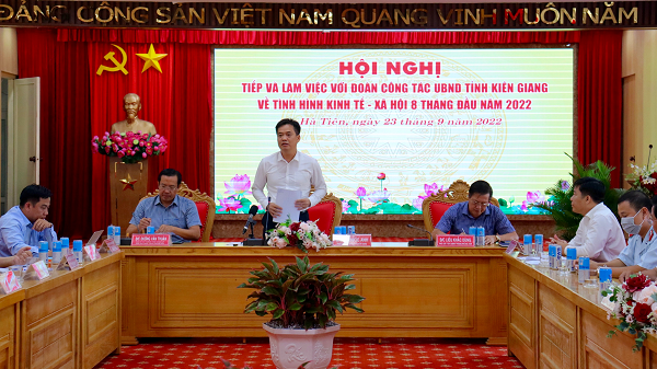 Đại diện lãnh đạo thành phố ông Mai Quốc Thắng, phó Chủ tịch UBND thành phố báo cáo tình hình kinh tế - xã hội của UBND thành phố Hà Tiên, từ đầu năm đến nay, tình hình dịch bệnh Covid-19 trên địa bàn thành phố cơ bản ổn định, nền kinh tế trong quá trình khôi phục, phát triển trở lại và đạt nhiều kết khả quan. Các chỉ tiêu phát triển kinh tế đều tăng so với cùng kỳ, một số lĩnh vực tăng cao như: Kim ngạch xuất khẩu đạt 65,53 triệu USD, đạt 115,15% kế hoạch; Sản lượng nuôi trồng thủy sản đạt trên 33.000 tấn, đạt 72,10% kế hoạch, tăng 2,26% so cùng kỳ; Tổng mức bán lẻ hàng hoá hoá và doanh thu dịch vụ đạt trên 12.000 tỷ đồng, đạt 80,38% kế hoạch, tăng 48,02% so với cùng kỳ.