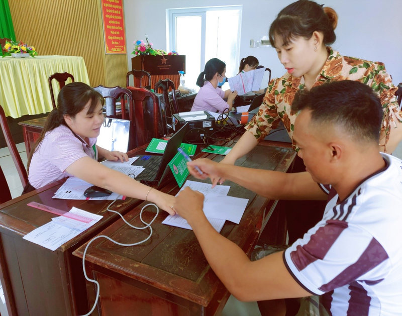 Cán bộ NHCSXH giải ngân cho NCHXAPT tại Điểm giao dịch xã