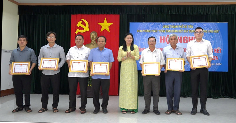 Ảnh: Bà Trương Thế Kiều - Ủy viên Thường vụ, Phó Chủ tịch UBND thành phố Hà Tiên trao thưởng cho các tập thể.