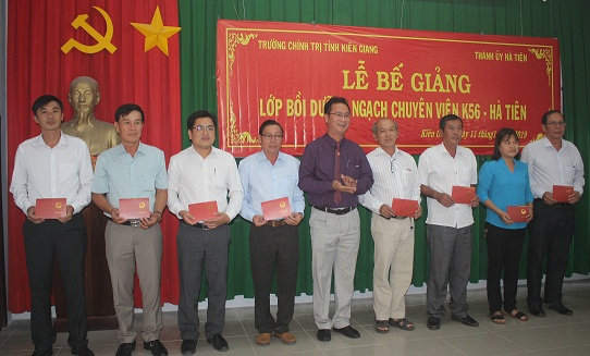 Ngày 11/11/2019, tại thành phố Hà Tiên, Trường Chính trị tỉnh Kiên Giang phối hợp với Thành ủy Hà Tiên tổ chức lễ bế giảng lớp Bồi dưỡng Ngạch chuyên viên khóa 56 năm 2019 cho 109 học viên là cán bộ chủ chốt, cán bộ trong nguồn quy hoạch của thành phố Hà Tiên và huyện Kiên Lương.